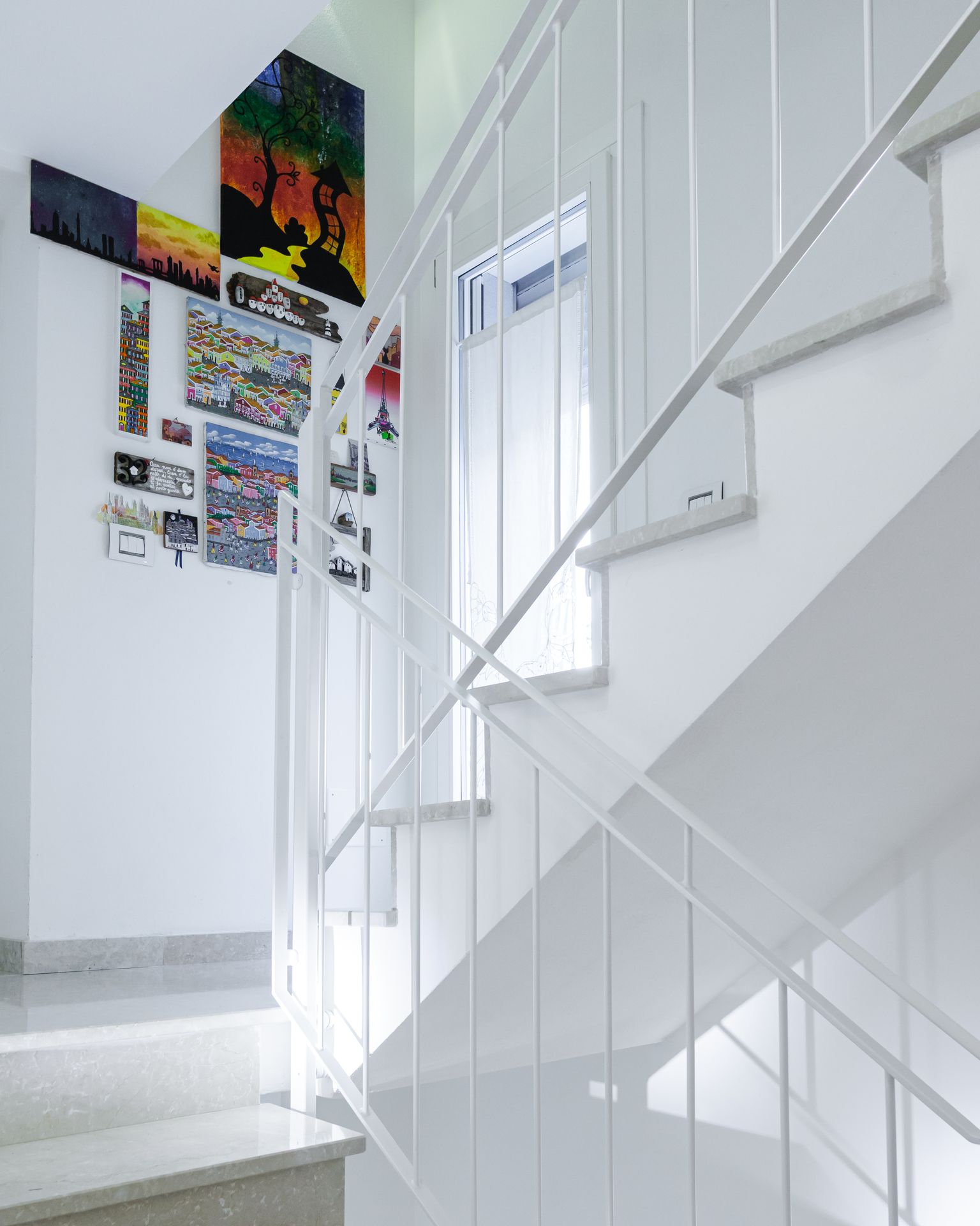 L’attenzione per ogni singolo dettaglio è ben visibile sul fronte principale: serramenti e ferramenta seguono forme essenziali total white.